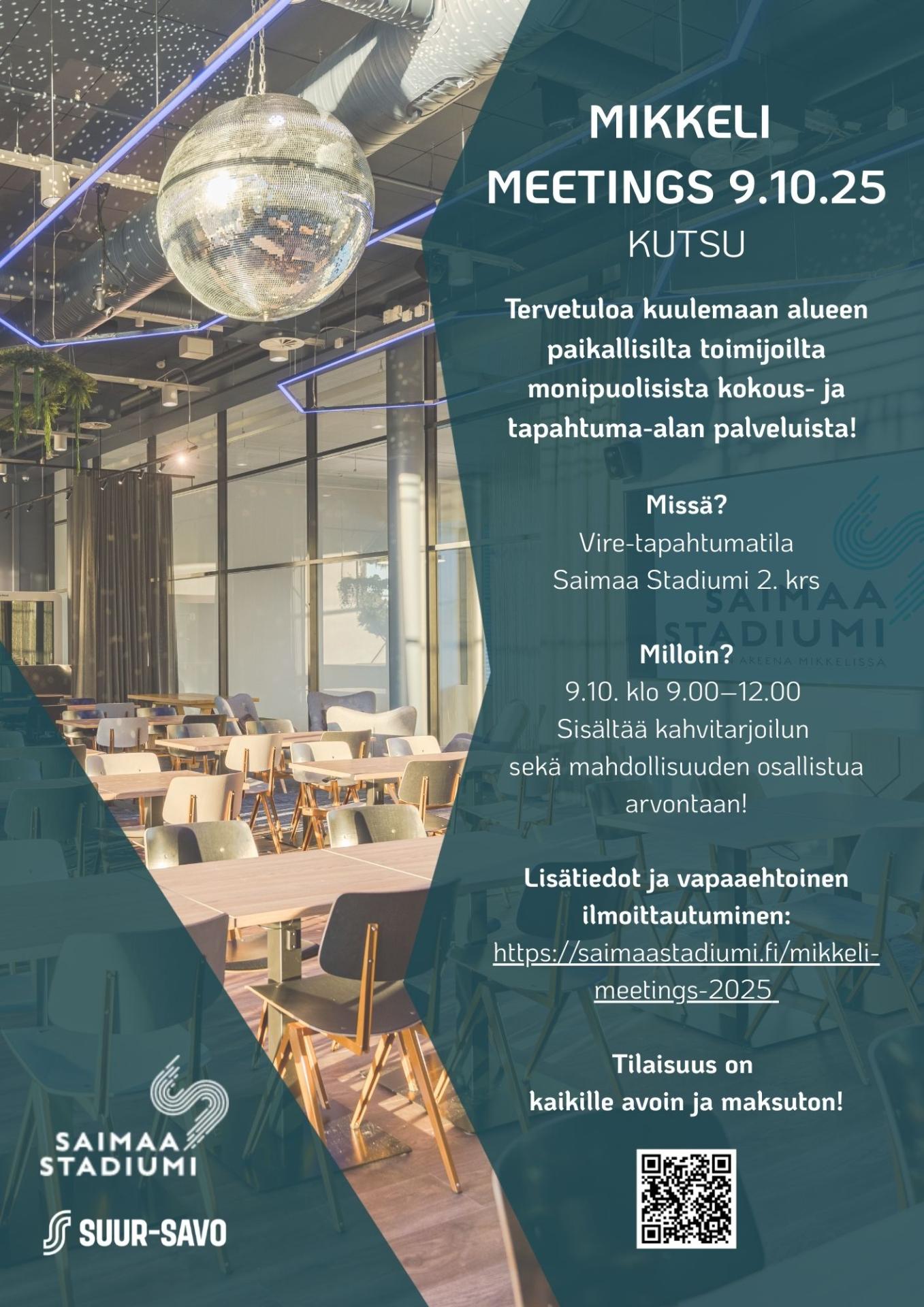 Tule mukaan Etelä-Savon keskuksen omille kokousmessuille – tiiviiseen aamupäivään, joka kokoaa yhteen alueen yritykset, tapahtumajärjestäjät ja palveluntarjoajat! Näytteilleasettajina yli 20 paikallista alan toimijaa esittelemässä toimintaansa.